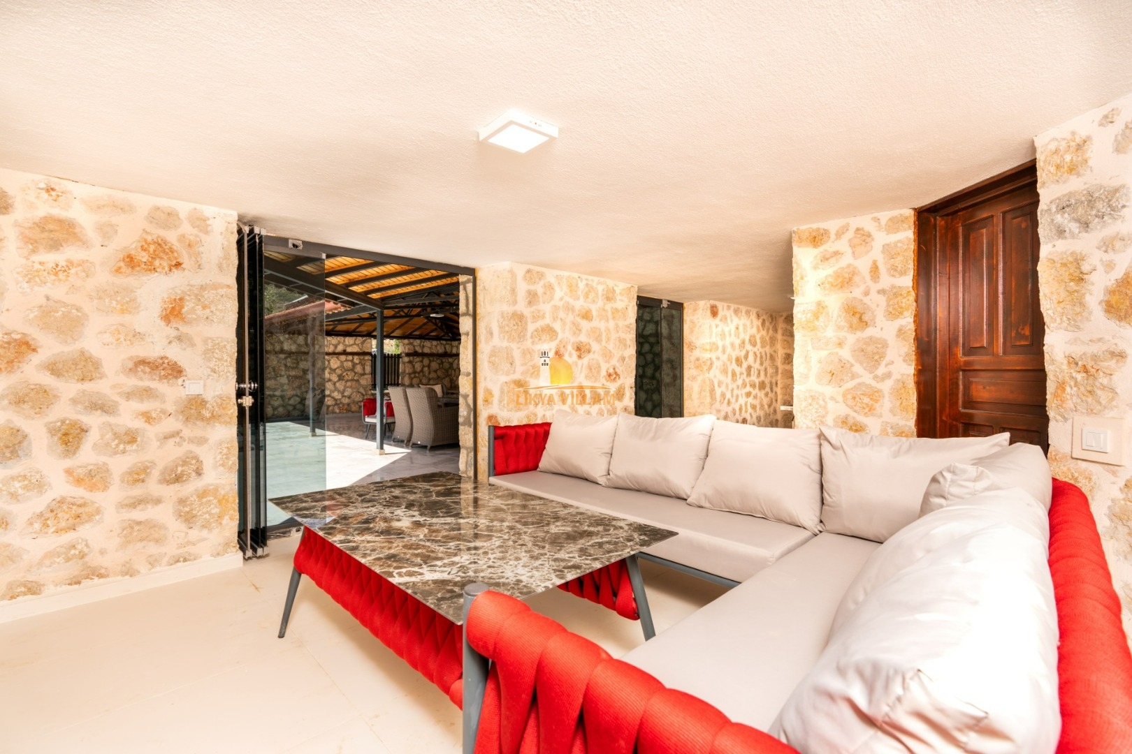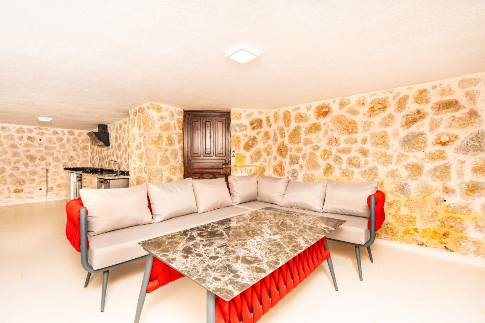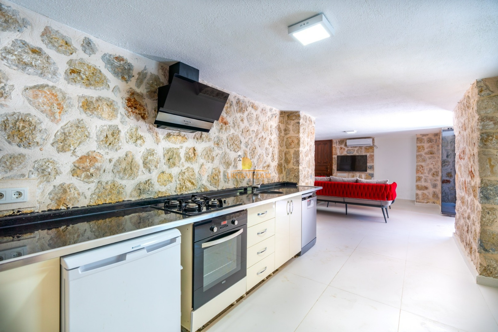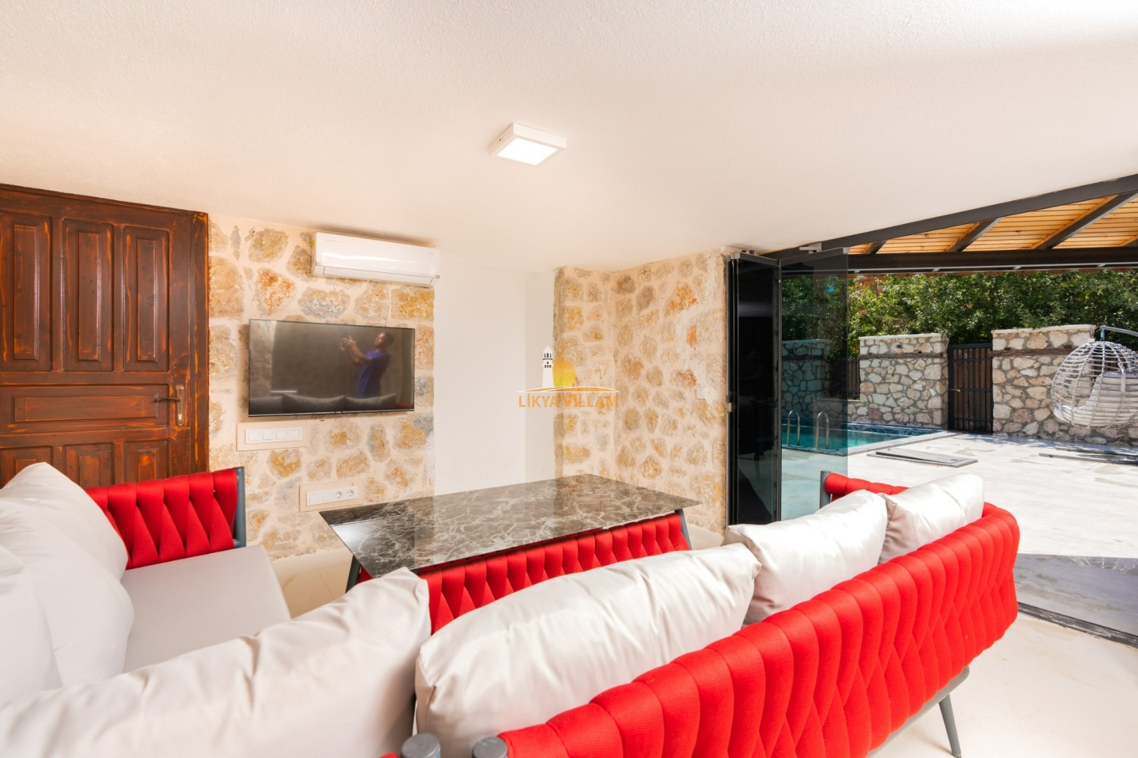 Steinvilla auf 3 Etagen mit 2 Wohnzimmern und 2 Küchen in authentischem Design in Kas / Bezirgan . Mit 3 Schlafzimmern bietet die Villa Platz für 6 Personen.