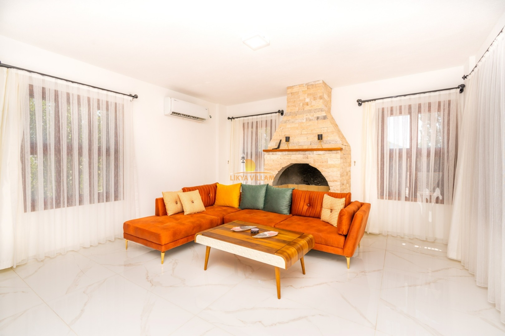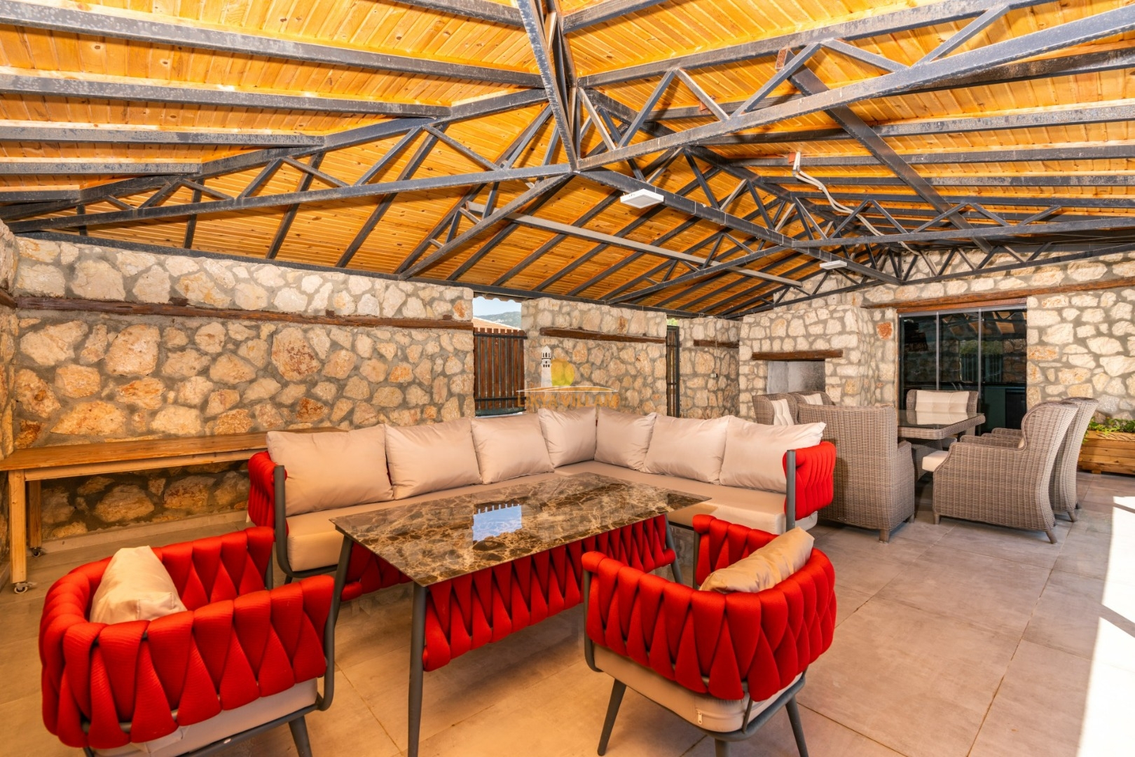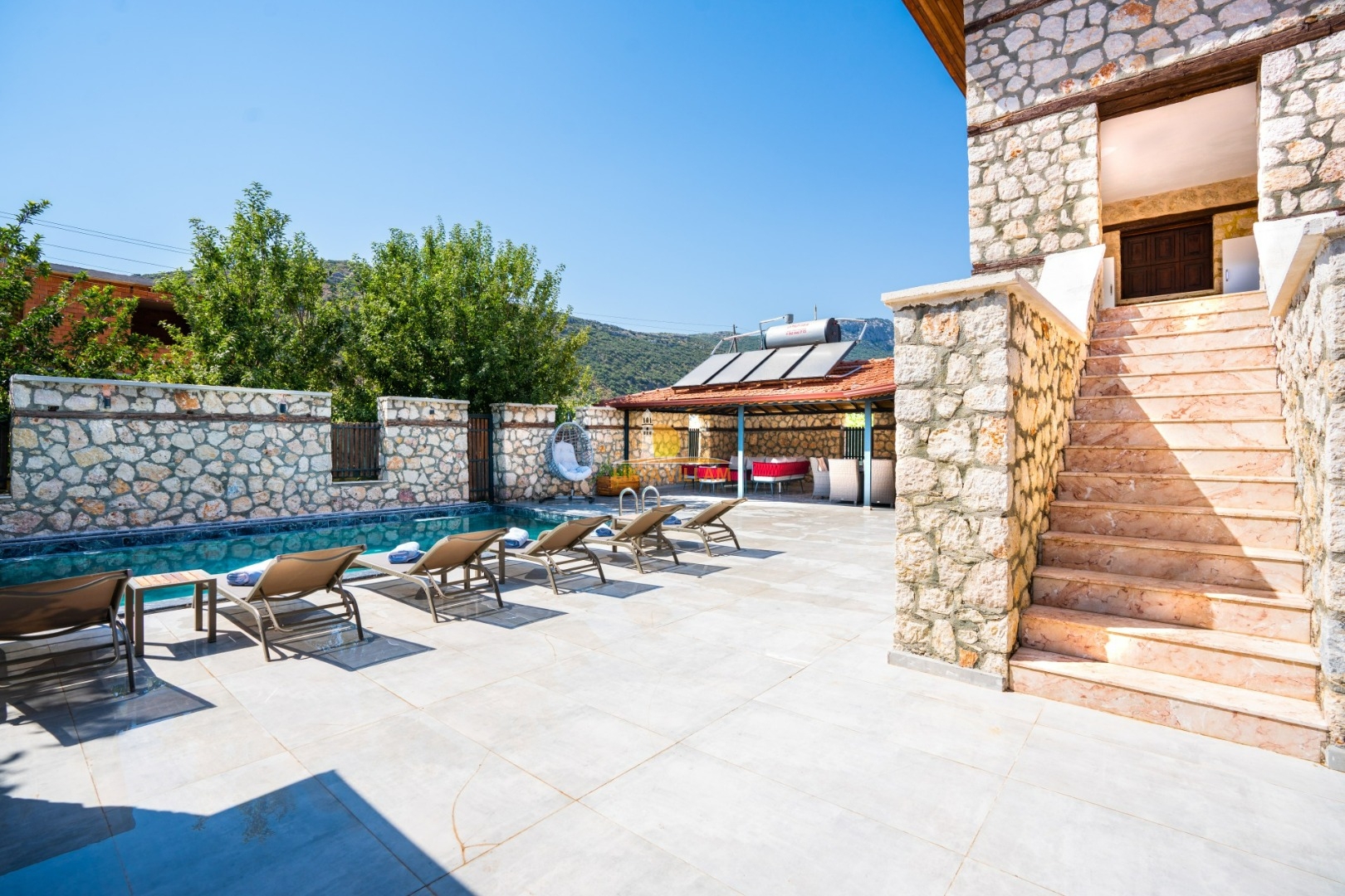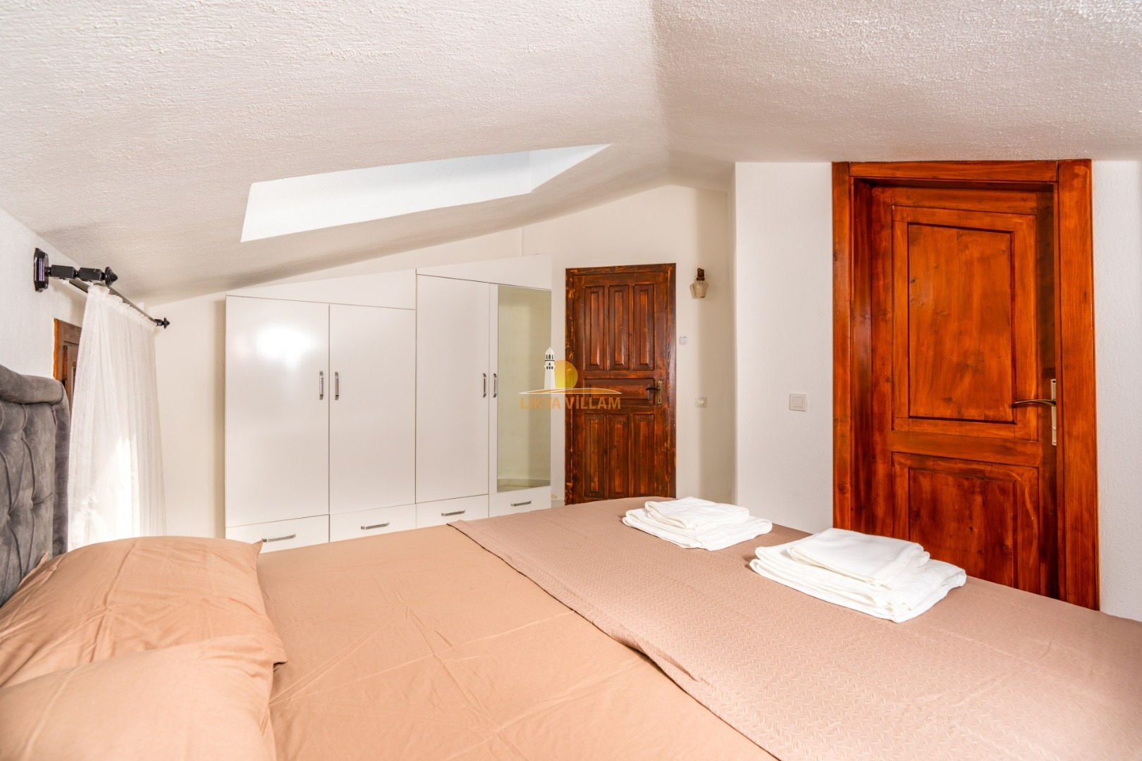 Steinvilla auf 3 Etagen mit 2 Wohnzimmern und 2 Küchen in authentischem Design in Kas / Bezirgan . Mit 3 Schlafzimmern bietet die Villa Platz für 6 Personen.